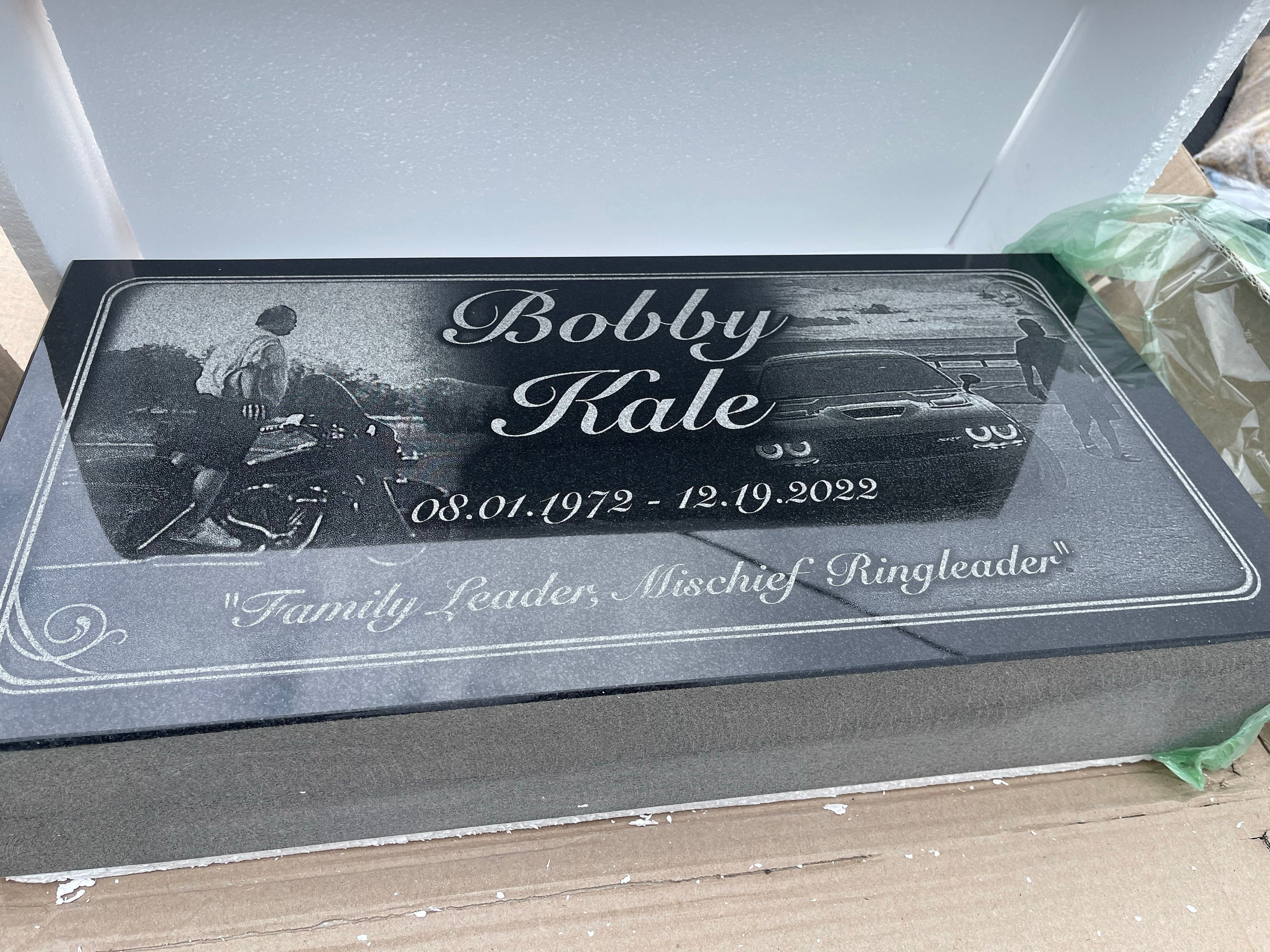 The Headstone is beautiful and very heavy. Alex was awesome to deal with through the whole process and very quick to respond. I purchased it on the 13th and received it on the 29th and for a custom item like this I’d say that is pretty fast. Overall I am extremely pleased with my purchase.